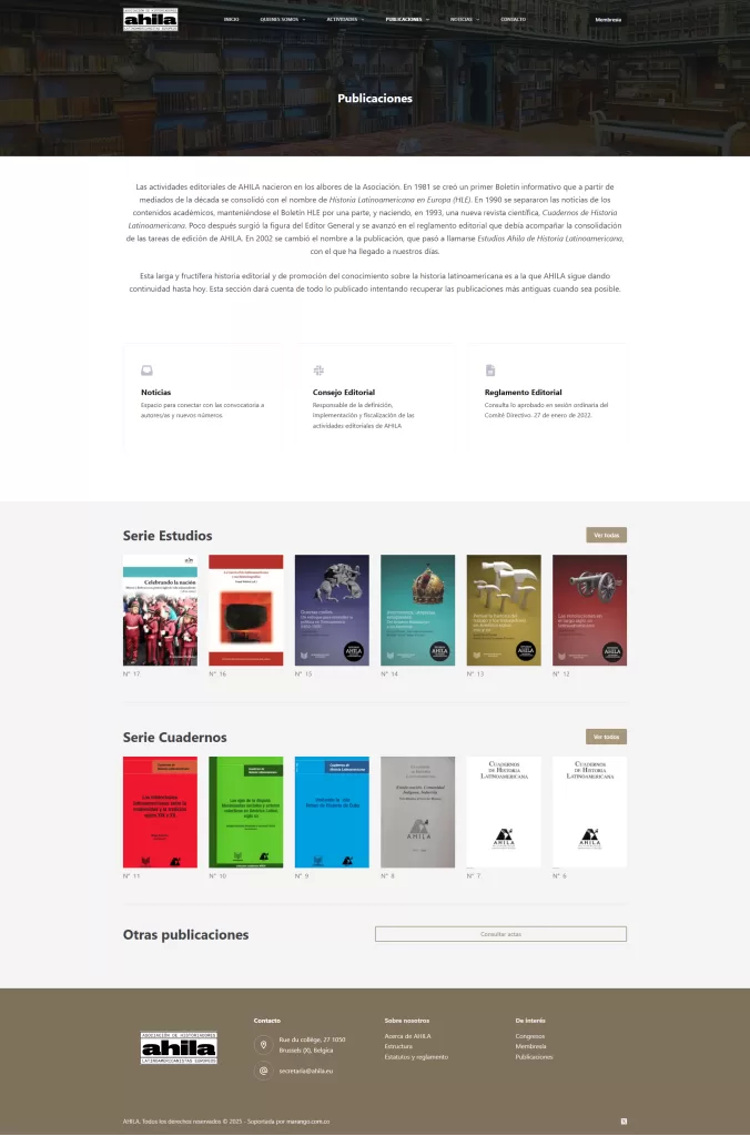 Intervención de diseño de sitio web institucional en CMS WORDPRESS, así como desarrollo de nueva sección de publicaciones para AHILA – Asociación de Historiadores Latinoamericanistas Europeos, 2025.